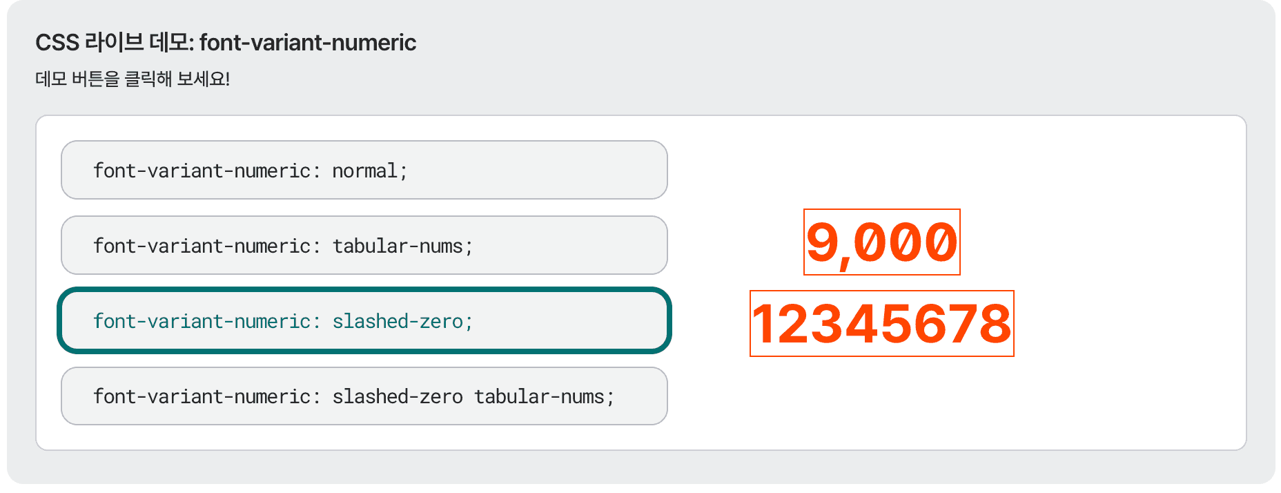 CSS의 font-variant-numeric 속성을 사용하면 숫자 형식과 관련된 스타일과 가독성을 개선하거나 텍스트와 숫자가 어우러지는 방식을 세밀하게 제어할 수 있다.
