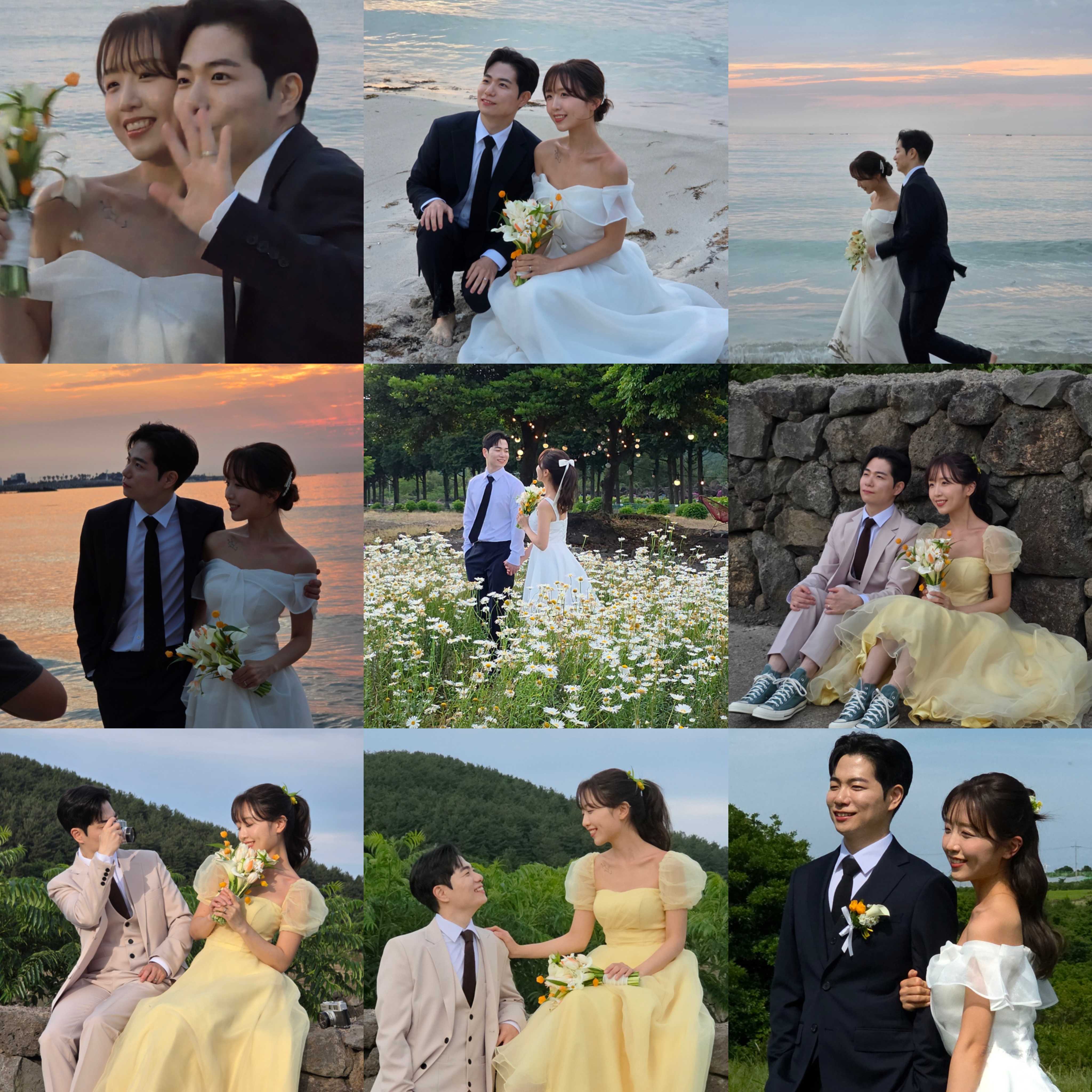 6월, 대망의 웨딩촬영. 나름 다이어트도 하고 표정연습도 해 가서 그런지 수월하게 잘 찍었다! 헤메와 작가님 디렉팅은 쏘쏘였지만. 우리가 스스로 잘 했다고 생각한다 ^^! 6월 첫째주에 너무 덥지도 않고 화창했던 제주 날씨 하늘에 넘 감사하다… ☀️