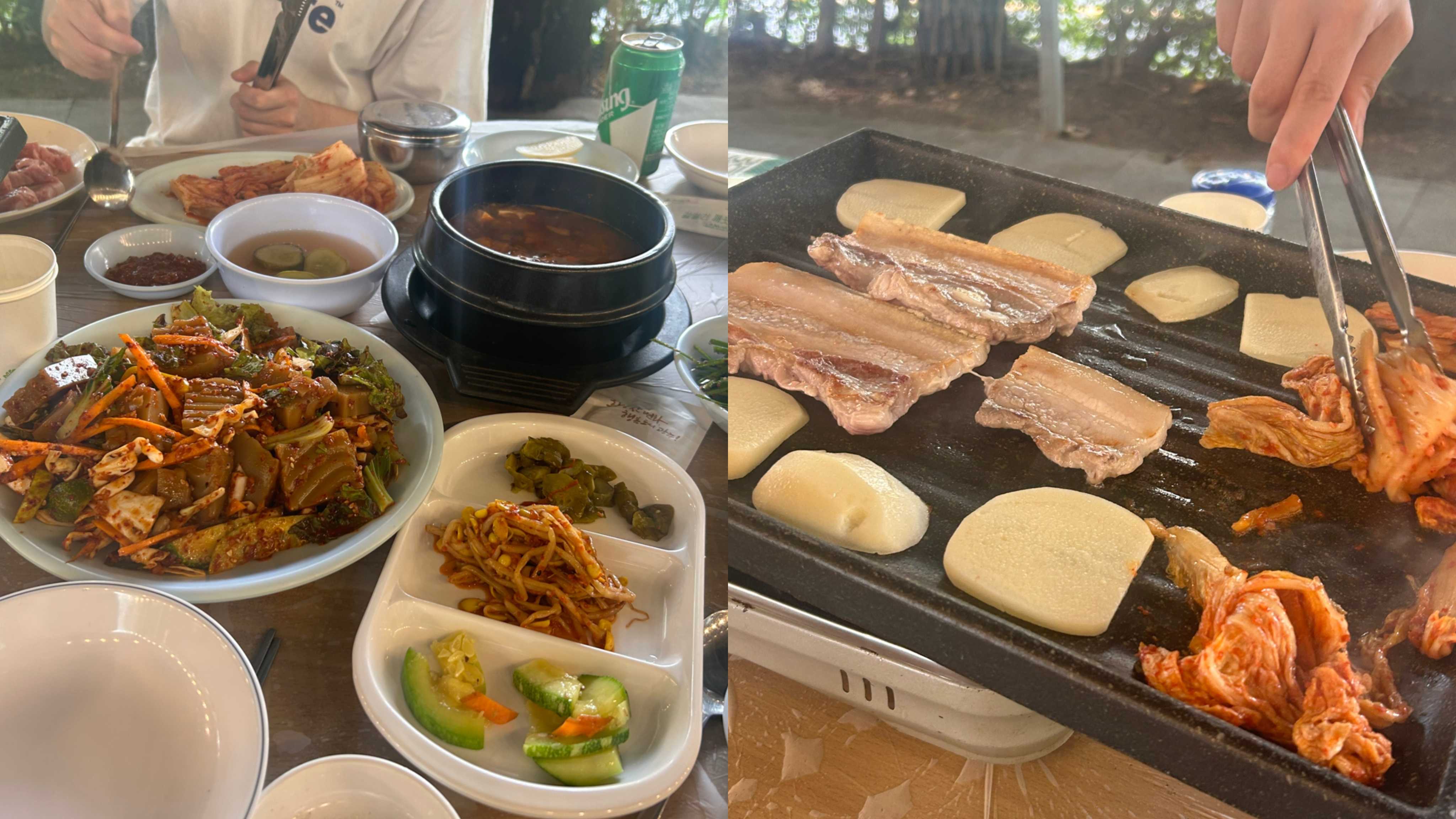 꼴랑 1시간 놀고 지쳐 일광욕이나 하다가 냅다 계곡물에 발 담그는 식당 가서 삼겹살 파티. 삼겹살에 도토리묵 조합 미쳤다구. 소식좌들 역시 다 못 먹어서 도토리묵 포장해서 집 와서 먹음 ㅎ